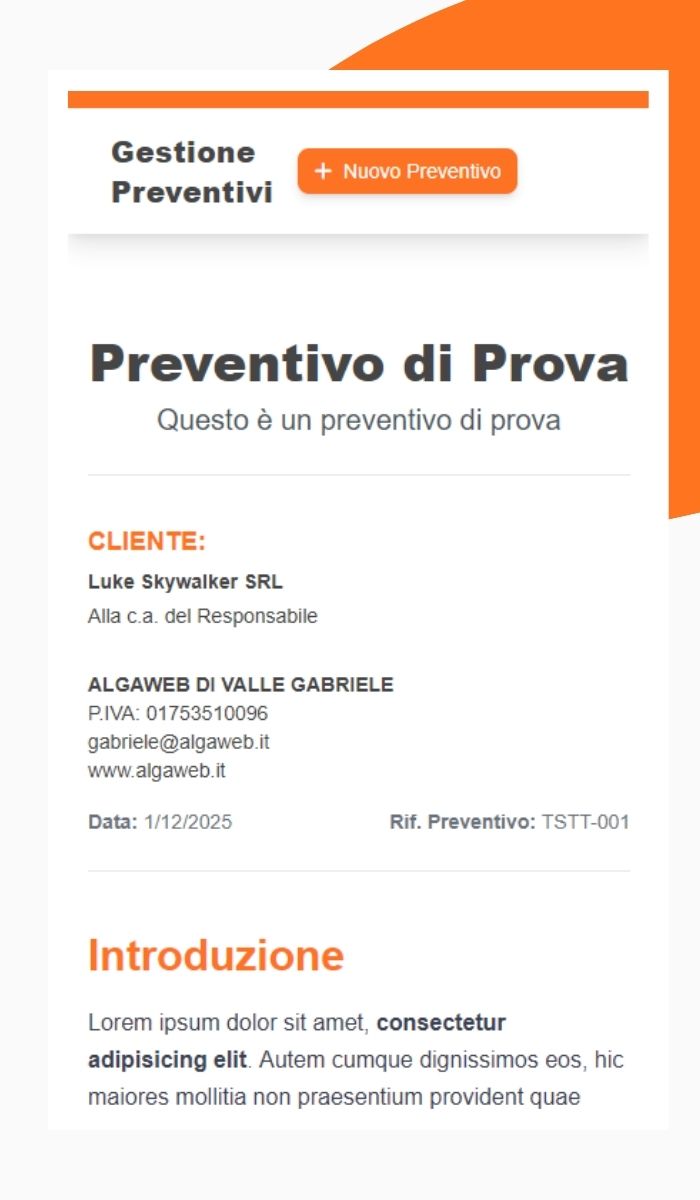 Strumento dedicato che permette di generare proposte di preventivo dettagliate e complete in pochi minuti. Archivia in modo organizzato tutti i documenti prodotti, trasformando un processo lungo e manuale in un'azione rapida e professionale.